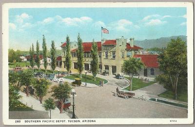 Title (ebay affiliate link): Southern Pacific Depot Tucson Arizona. Old Harry Herz Postcard. Cars Flag