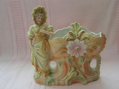 Antique bisque figurine Flower basket / vase Victorian look beaded 3485 German?