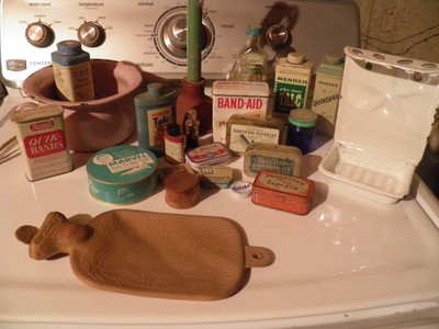 Title (ebay affiliate link): Primitive bathroom smalls, chamber pot, tins, medicines plunger etc...etc...