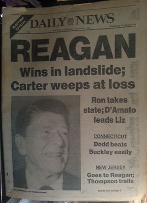 Title (ebay affiliate link): NY DAILY NEWS- 11/5/1980 REAGAN WINS IN LANDSLIDE;CARTER WEEPS AT LOSS