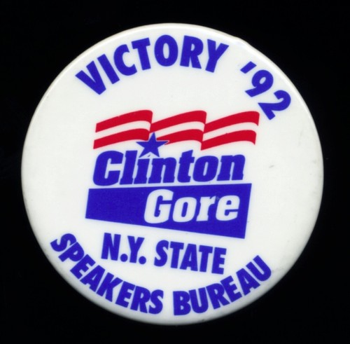 Title (ebay affiliate link): Victory '92 Clinton Gore NY State Speakers Bureau button pin made by NG Slater