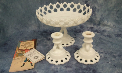 White Milk Glass Lace Edge 10" Fruit Bowl and candles stick Westmoreland Doric