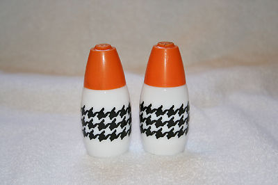 Title (ebay affiliate link): VINTAGE WESTINGHOUSE MILK GLASS SALT & PEPPER SHAKERS HOUNDSTOOTH ORANGE TOPS