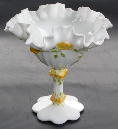 Fenton Hand Painted Cabbage Rose Compote-White Milk-Ruffled Edge gg36