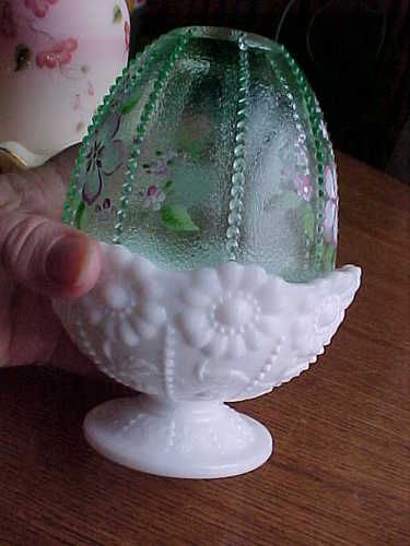 Title (ebay affiliate link): Fenton Glass FAIRY LAMP candleholder mILK White Green TOp Flowers Stephens & BOX