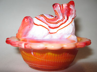 Title (ebay affiliate link): Ruby Red & milk slag glass salt cellar celt cat kitten kitty on nest basket dish