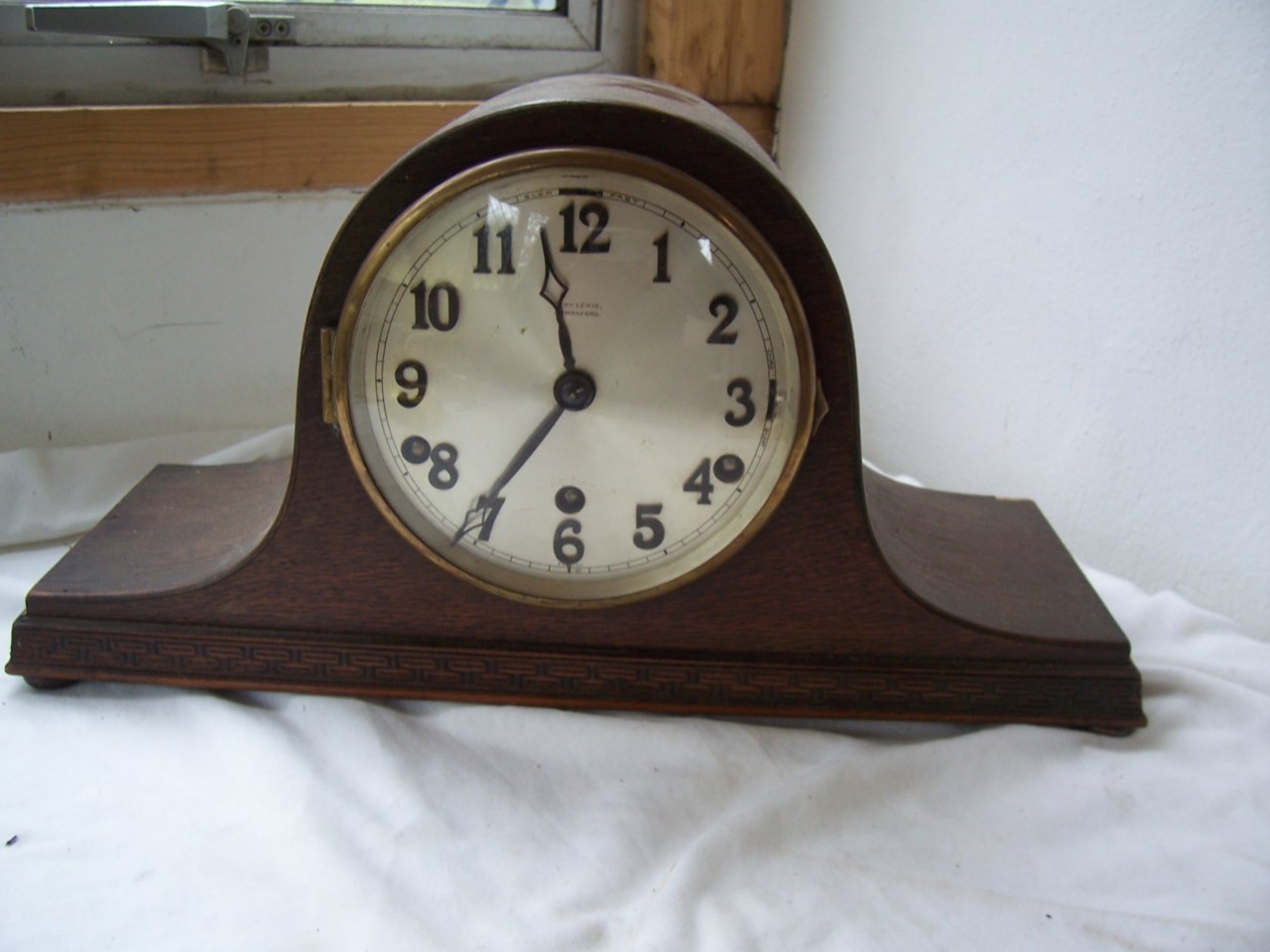 ANTIQUE WOODEN MANTEL CLOCK ANVIL EVAN LEWIS AMMANFORD