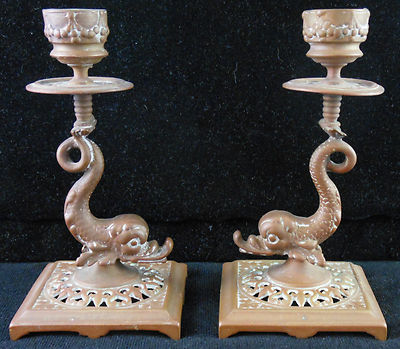 Great Pr. Antique Brass Dolphin Candlesticks, Nice Patina