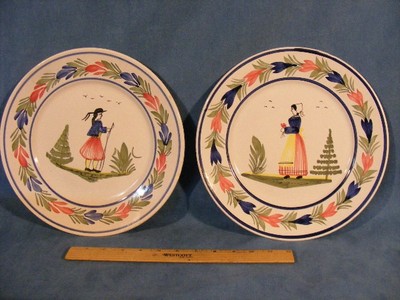PAIR 11" HB QUIMPER FRENCH ART POTTERY DINNER PLATES - MAN & WOMAN
