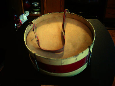 Title (ebay affiliate link): ANTIQUE VINTAGE RED AND OFF WHITE TOY DRUM WITH CLOTH RIBBON NECK STRING