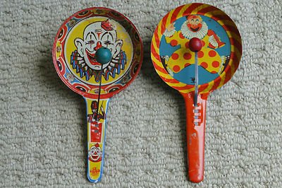 2 Vintage Tin Metal Toy Party Clown Noisemakers