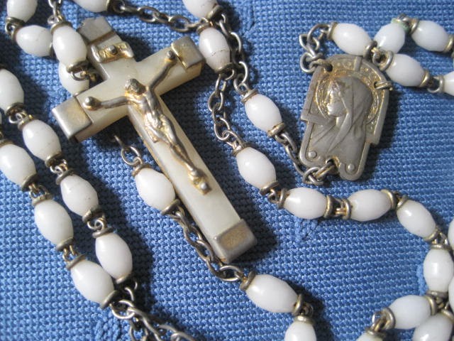 ANTIQUE ESTATE ROSARY MILK GLASS BEADS FROM FRANCE