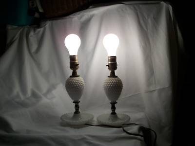 **PAIR VTG BEDSIDE HOBNAIL MILK GLASS LAMPS WORK GOOD