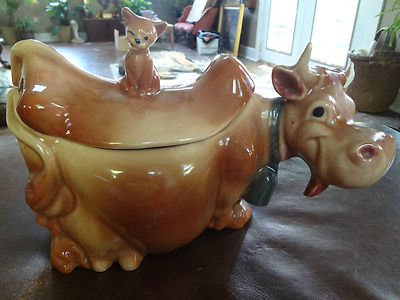 Title (ebay affiliate link): Vintage 1950's Brush McCoy Brown Cookie Jar-Figural Cow w/ Cat Handle Finial