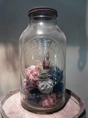 Title (ebay affiliate link): Primitive Old Horlick Mason Jar Gathering with Rag Balls and Timer Battery Taper