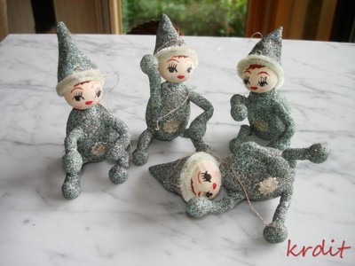 Title (ebay affiliate link): 4 Antique Vintage Paper Mache Spun Cotton Pipe Cleaner Pixie Elves Elf Ornaments