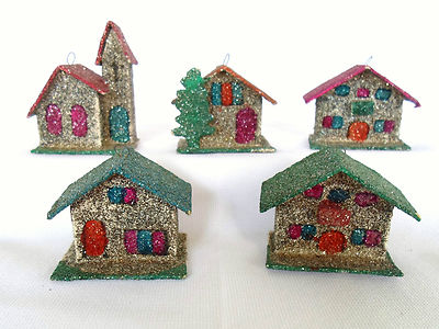 Title (ebay affiliate link): 5 VINTAGE PUTZ CARDBOARD MICA HOUSES - CHURCH - CHRISTMAS ORNAMENTS - JAPAN