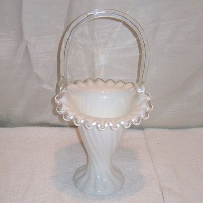 FENTON WHITE MILK-GLASS TALL RUFFLED BASKET CANDY DISH