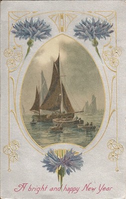 Title (ebay affiliate link): Sailboat Scene With Pretty Cornflowers on 1910 Art Nouveau New Year Postcard
