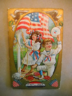 Title (ebay affiliate link): CHILDREN CELEBRATE JULY 4th antique 1909 used EMBOSSED postcard CHROMOLITHO gold