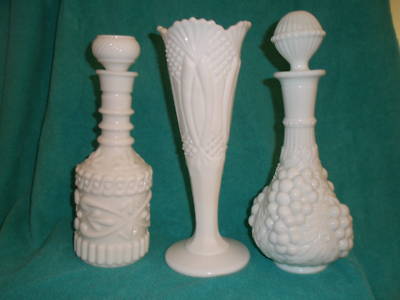milk glass vase and two decanters