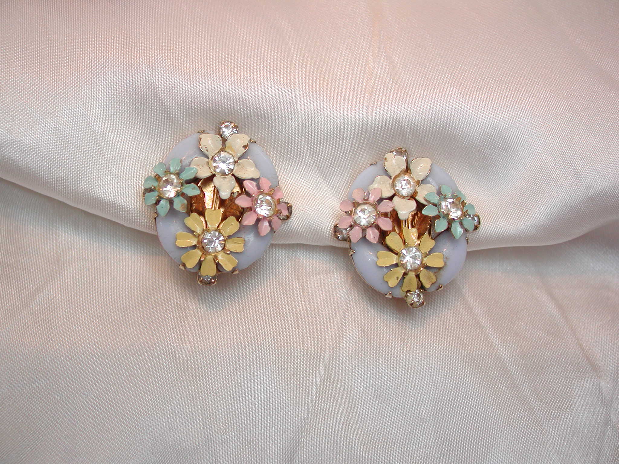 VINTAGE BLUE MILK GLASS RHINESTONE ENAMEL EARRINGS
