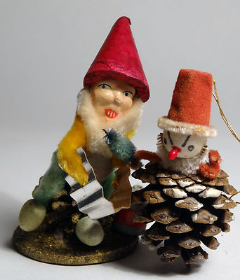 Title (ebay affiliate link): Vintage Spun Cotton, Chenille, Pinecone, Christmas Tree Ornament Elves, Lot of 2