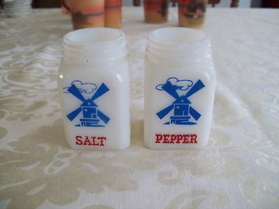 VINTAGE PAIR MILK GLASS SALT & PEPPER SHAKERS WINDMILLS