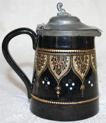 Antique Black Jackfield Pottery Syrup Pitcher jug~ Enamel jeweled Pewter gold
