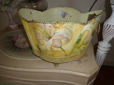 Title (ebay affiliate link): Shabby Chic Vintage Toleware Magazine Holder, Yellow, Trash Can, Antique