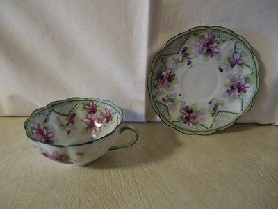 HAND PAINTED PORCELAIN CHINA CUP & SAUCERS - VIOLETS