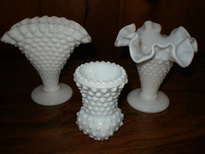 3 FENTON HOBNAIL ART GLASS VASE RUFFLED RIM MILK WHITE