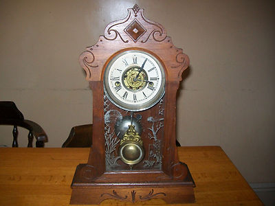 Title (ebay affiliate link): Antique wind up wood mantle / shelf clock. Works but needs restoration & work.