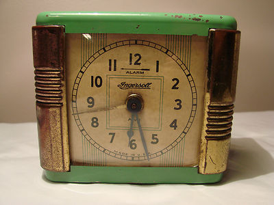 Title (ebay affiliate link): Nice Antique Art Deco INGERSOLL Wind Up Alarm Clock Green and Gold Tin... Works!