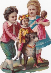 Antique dog children playing Victorian artist doll scrapbook diecut