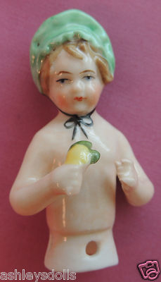 Title (ebay affiliate link): Antique German China Half-Doll in Green Bonnet, 2.5 IN, Arms Away w Flower