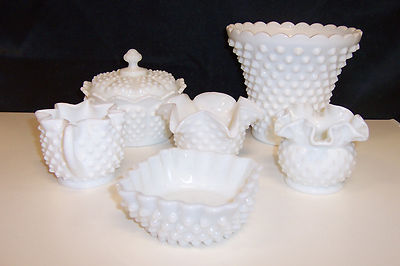 Title (ebay affiliate link): 6 MILK GLASS HOBNAIL GLASSWARE, VASE CANDY DISH SUGAR BOWL Vintage