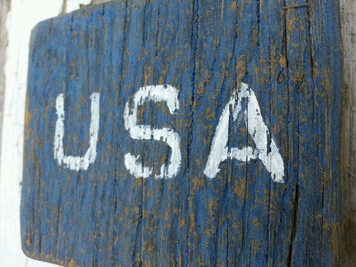 Primitive old early worn cabin wood sign USA summertime lake july 4 flag Petite