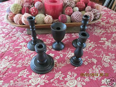 PRIMITIVE GATHERING OF 5 WOOD CANDLESTICKS