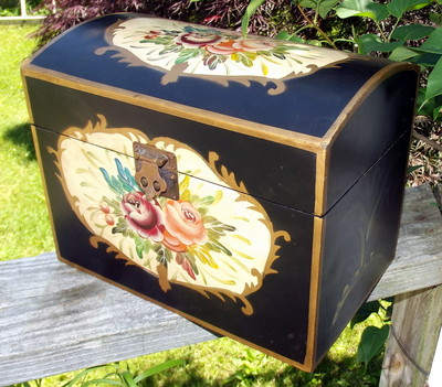 Title (ebay affiliate link): Gorgeous Vintage Large Black Tole Painted Box Chest with a Rose & Leaf Motif