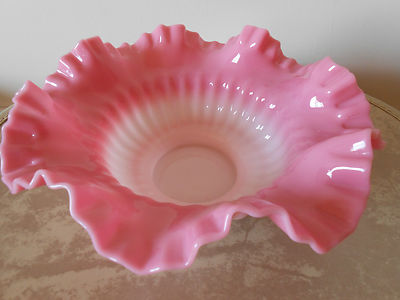 Title (ebay affiliate link): PINK & WHITE GLASS BRIDE'S BASKET BRIDAL BOWL W/ RUFFLED EDGE TOP MELON PATTERN