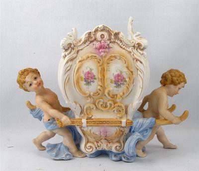 ANTIQUE BISQUE CACHE POT PLANTER W/ 2 CUPIDS PUTTI