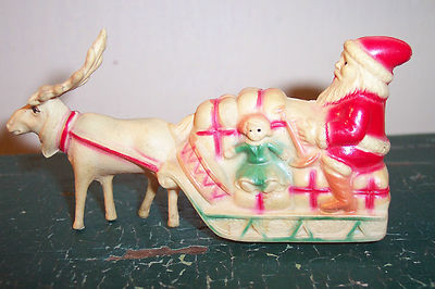 Title (ebay affiliate link): vtg old celluloid santa on sleigh with presents and doll