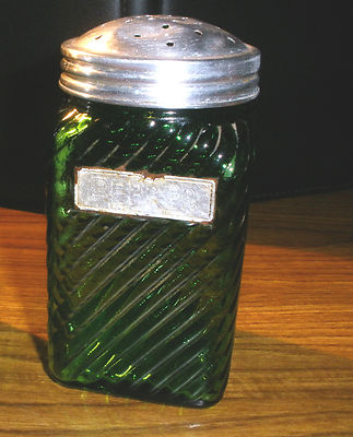Title (ebay affiliate link): Vintage Depression Era Owens-Illinois Green Swirled Glass Pepper Shaker W/Lid