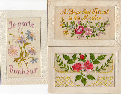 3x GREETINGS-3 EMBROIDERED WW1 SILK POSTCARDS