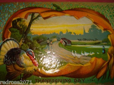 old Holiday THANKSGIVING postcard Turkey landscape inside Pumpkin Ducks on Road