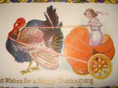 Title (ebay affiliate link): old Holiday THANKSGIVING postcard Fantasy Turkey pulling Girl in Pumpkin Cart