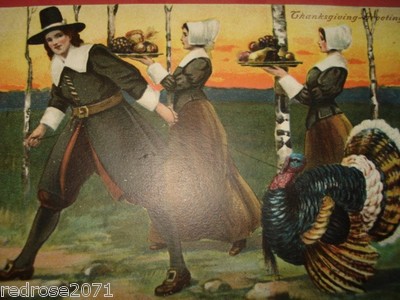 P SANDER Old Holiday THANKSGIVING postcard Pilgrim Man Women Turkey platters