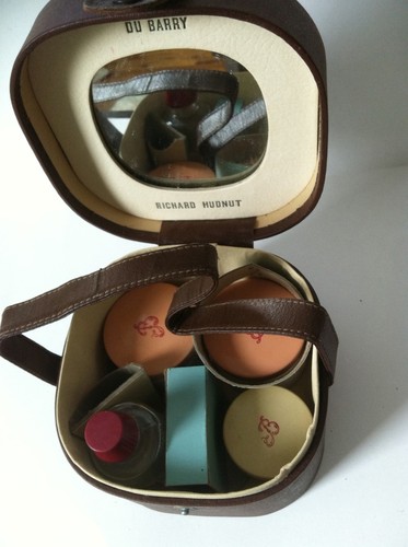 Title (ebay affiliate link): Vintage 1940's Richard Hudnut DuBarry Travel Train Case with Milk Glass Jars