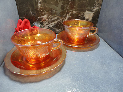 Orange Marigold Carnival flashed peach Depression Glass (4)pc 2cup & 2saucer lot